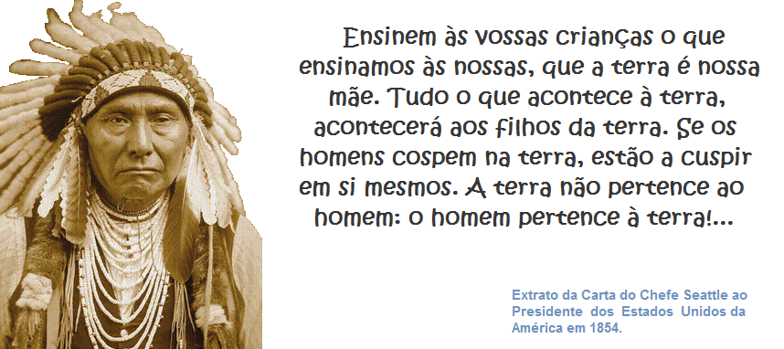 “Como é que se pode comprar ou vender o céu, o calor da terra? Essa ideia parece-nos estranha. Se não possuímos a frescura do ar e o brilho da água, como é possível comprá-los? Cada pedaço desta terra é sagrado para meu povo. (…) Se lhes vendermos a terra, (…) devem ensinar às vossas crianças que ela é sagrada e que cada reflexo nas águas límpidas dos lagos fala de acontecimentos e lembranças da vida de meu povo. (…) Se lhes vendermos a nossa terra, vocês devem lembrar e ensinar os vossos filhos que os rios são nossos irmãos, e vossos também. (…) Sabemos que o homem branco não compreende os nossos costumes. Uma porção de terra para ele, tem o mesmo significado que qualquer outra coisa, pois é um forasteiro que vem à noite e extrai da terra, aquilo que necessita. A terra não é sua irmã, mas sua inimiga e, quando ele a conquista, prossegue o seu caminho. Deixa para trás os túmulos dos seus antepassados e não se incomoda. Arranca da terra aquilo que seria dos seus filhos e netos. A sepultura do seu pai e os direitos dos seus filhos são esquecidos. Trata a sua mãe, a terra, e o seu irmão, o céu, como coisas que possam ser compradas, saqueadas, vendidas como carneiros ou enfeites coloridos. O seu apetite devorará a terra, deixando somente um deserto. Eu não sei, os nossos costumes são diferentes dos vossos. A visão das suas cidades fere os olhos do homem vermelho. Talvez seja porque o homem vermelho é um selvagem e não compreenda. (…) Há uma ligação em tudo. Vocês devem ensinar às vossa crianças que o solo a seus pés é a cinza dos nossos avós. Para que respeitem a terra, digam a vossos filhos que ela foi enriquecida com as vidas do nosso povo. Ensinem às vossas crianças o que ensinamos às nossas, que a terra é nossa mãe. (…) Isto sabemos: todas as coisas estão ligadas como o sangue que une uma família. Há uma ligação em tudo. O que ocorrer com a terra recairá sobre os filhos da terra. O homem não tramou o tecido da vida; ele é simplesmente um de seus fios. Tudo o que fizer ao tecido, fará a si mesmo. (…) A terra é-lhe preciosa e feri-la é desprezar o seu criador. Os brancos também passarão: talvez mais cedo que todas as outras tribos.