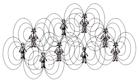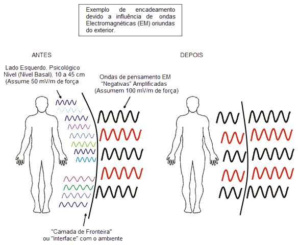 Vamos agora considerar a profunda influência que o ambiente tem sobre o nível psicológico basal do lado esquerdo do cérebro. Imaginemos uma pessoa fundamentalmente feliz que entra numa sala cheia de pessoas fundamentalmente infelizes. Consideremos agora que as pessoas infelizes estão a transmitir ideias subconscientes de negatividade (ex: ressentimento, revolta, desdém, etc), para a pessoa feliz ou para o ambiente. Os pensamentos negativos de muitas pessoas amplificam-se e geram um campo coletivo “negativo”. A pessoa feliz sofre o impacto desta campo de pensamento, e se a força combinada dos pensamentos negativos excede a força do seu nível basal, a pessoa “sentirá” fisicamente essa negatividade (mesmo que não hajam sinais físicos óbvios de negatividade na sala), passando a sentir irritabilidade, instabilidade, sentimentos e pensamentos negativos, etc… Esta é uma forma de percepção extrasensorial (hipercomunicação), e deve-se à interacção de estímulos externos pelo lado esquerdo do nível psicológico.
