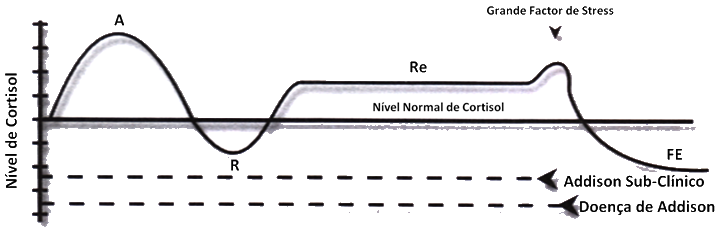 - Quando as adrenais estão cansadas, o output de cortisol está diminuído e por isso possuímos baixos níveis de cortisol circulantes na corrente sanguínea.