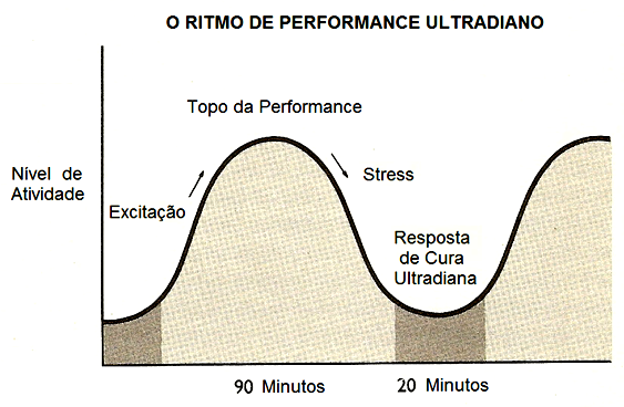 Figura: O ritmo de performance ultradiana é um padrão com grandes variações alternando entre 90 e 120 minutos de atividade com 20 minutos de rejuvenescimento. Existem amplas variações entre sujeitos e situações no timing destes ritmos. Eles mudam facilmente para nos ajudar a adaptar ás exigências em mudança e circunstâncias do mundo real.