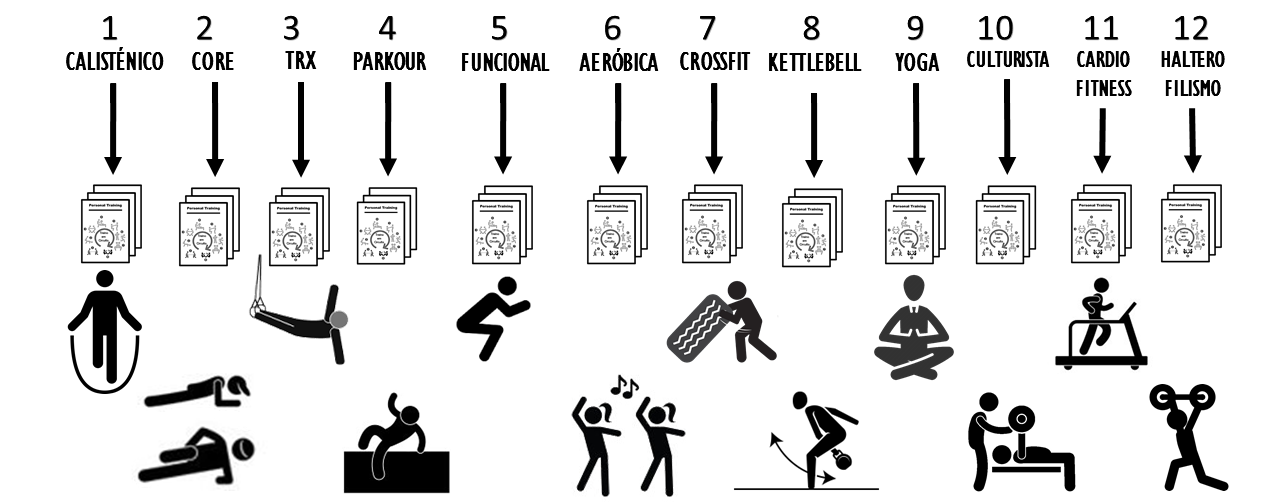 - Pesos, halteres, bolas medicinais, resistências elásticas, TRX, cordas, pneus, bastões, ktlebel, bosu, fitnessball, espaldares, bancos suecos e outros, etc…