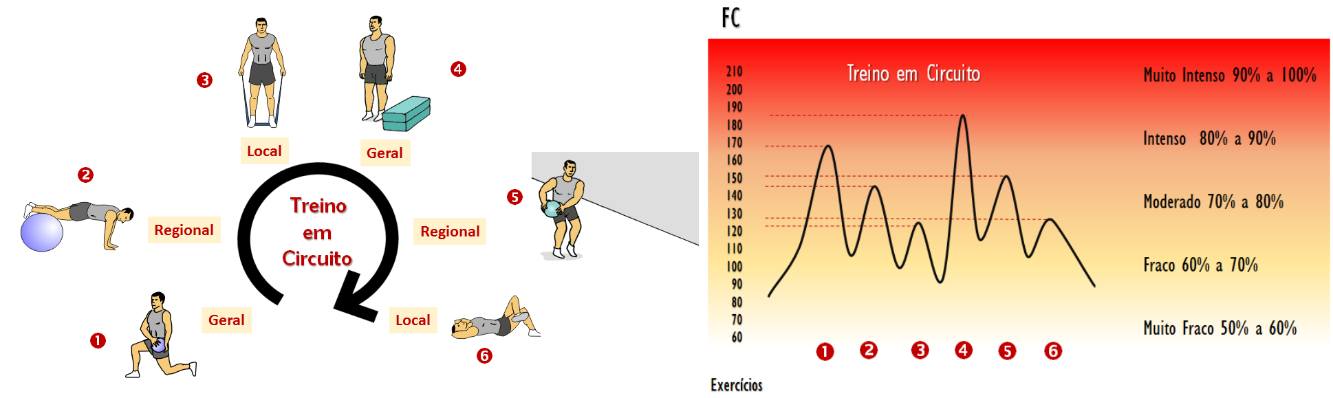 - Alternar a sequência de Exercícios: Gerais (Intensidade elevada) – Regionais (Intensidade Média) – Locais (Intensidade baixa) de forma a promover variações de intensidade e alternância entre a solicitação metabólica geral intensa com exercícios de solicitação metabólica baixa mas com envolvimento muscular mais localizado).