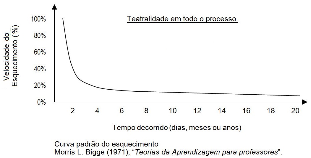 Curva padrão do esquecimento: a falta de tempo para processar toda a informação de todas as disciplinas implica que muitos jovens apenas estudem na véspera dos testes tentando memorizar a matéria para a debitar na avaliação. Este estudo de última hora implica um ritmo de esquecimento rápido (Gráfico do livro de Morris L. Bigge. 1971. Teorias da Aprendizagem para professores”, página 304 | Se há 40 anos se conhece o problema relacionado com esta Empreitada educativa (Obesidade Curricular) – criticada também por Simão Dias em 1895 (122 anos), porque continuamos a persistir neste erro?!…
