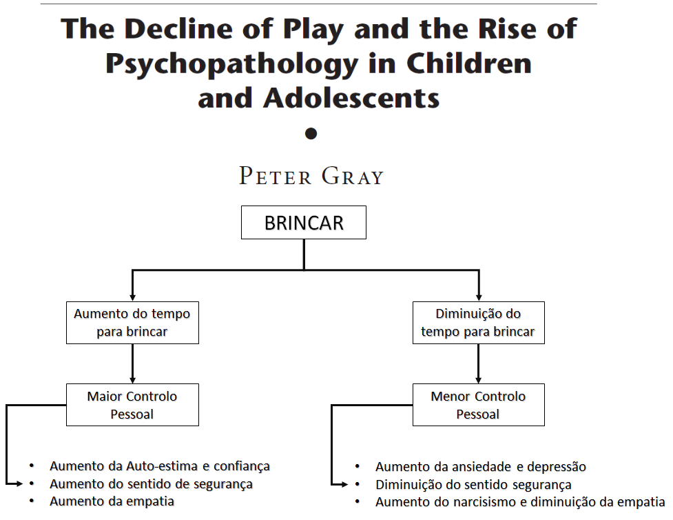 - Peter Gray (2011); “The Decline of Play and the Rise of Psychopathology in Children and Adolescents”; American Journal of Play; Vol. 3, number 4; pp. 443-463: PDF