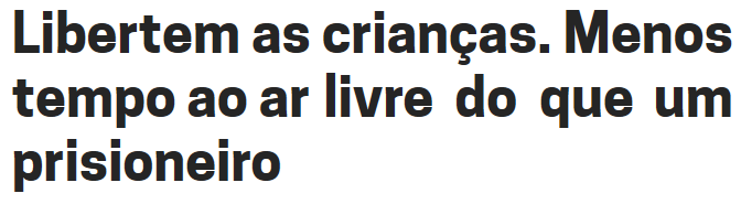 Os presos de uma prisão de alta segurança nos Estados Unidos têm autorização para passarem duas horas no pátio. Por estranho que pareça, é o dobro do tempo que passam ao ar livre os jovens de todo o mundo, entre os 5 e os 12 anos. As marcas de detergente OMO e Persil levaram a cabo um estudo em 12 países, entrevistando mais de 12 mil pais com crianças destas idades. As conclusões apontam para menos de meia hora na rua.