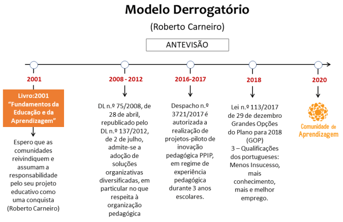 Roberto Carneiro defende que a escola deve ter total liberdade para criar e que se deve descentralizar a regulação, o controlo e a avaliação para as escolas (chama este processo de Modelo Derrogatório). Da mesma forma que o Ministério tem de derrogar nas escolas o poder para definir os seus currículos, também o Professor tem de derrogar a responsabilidade no aluno para que este crie o seu próprio currículo em função dos seus objetivos pessoais e do perfil de aluno.
