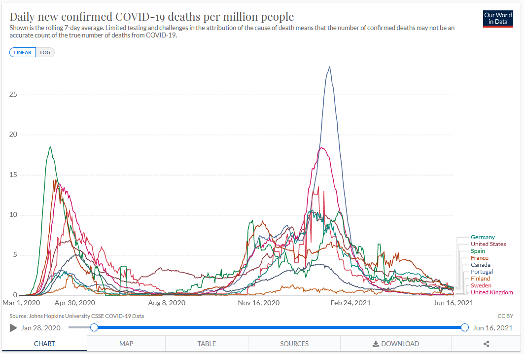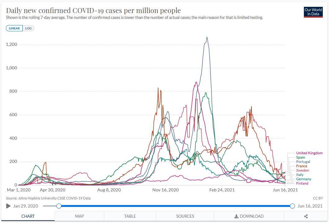 Se compararmos o perfil da Suécia, que não encerrou a economia, com os restantes países apresentados, verifica-se que o encerramento da sociedade não alterou significativamente a curva de evolução dos casos? Verifica-se um perfil identico de evolução para ambos os modelos!…