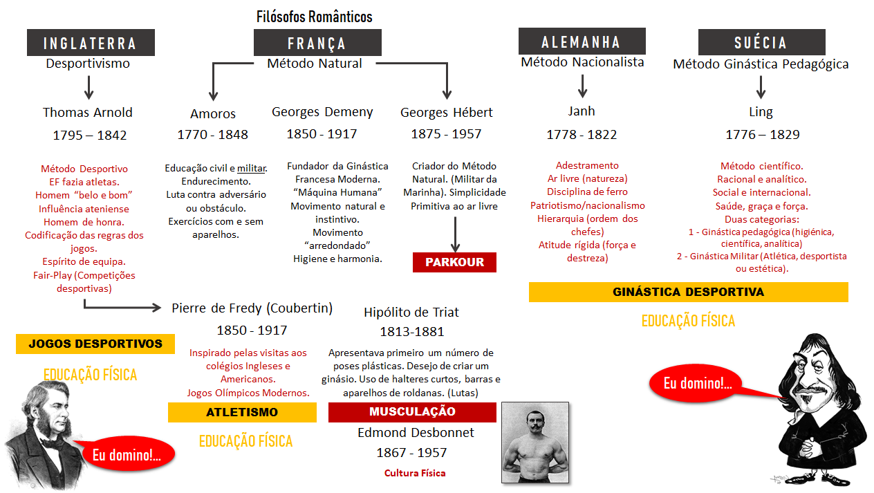 - Georges Hébert, oficial da marinha francesa que, na primeira metade do século XX, elaborou um conjunto de procedimentos para exercitar o corpo, o qual denominou “Método Natural“. A sua abordagem preconiza uma relação física com o ambiente natural, centrada “no valor intrínseco da natureza” a qual é vista como um ginásio natural. “Nenhuma cultura física dita científica, fisiológica ou outra, jamais produziu seres fisicamente superiores em beleza, saúde e força a certos habitantes naturais de todas as regiões do mundo (Hébert, 1941).