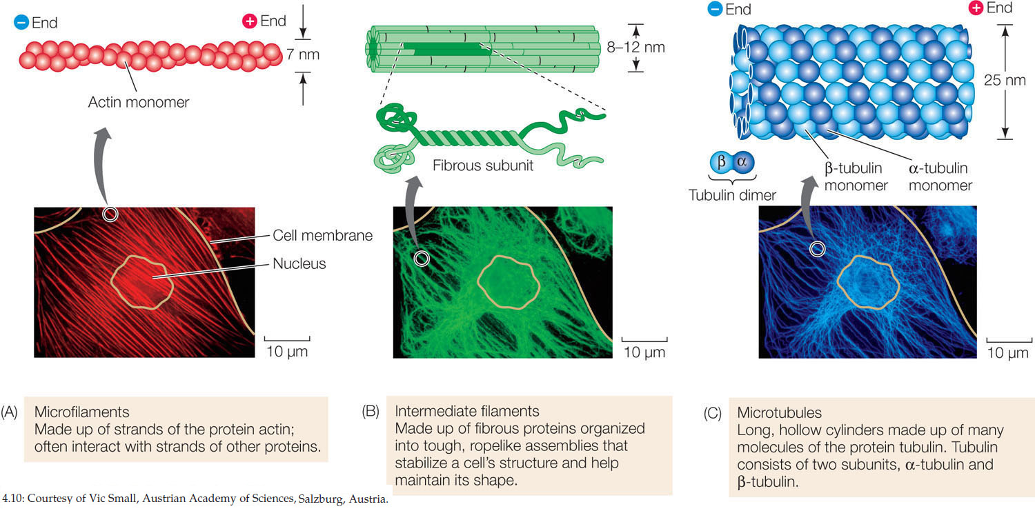 Três componentes estruturais altamente visíveis e importantes do citoesqueleto. Colorações específicas foram usadas. Estas estruturas mantêm e reforçam a forma celular e contribuem para o movimento celular.