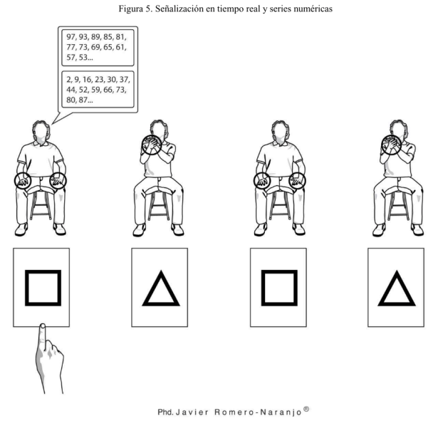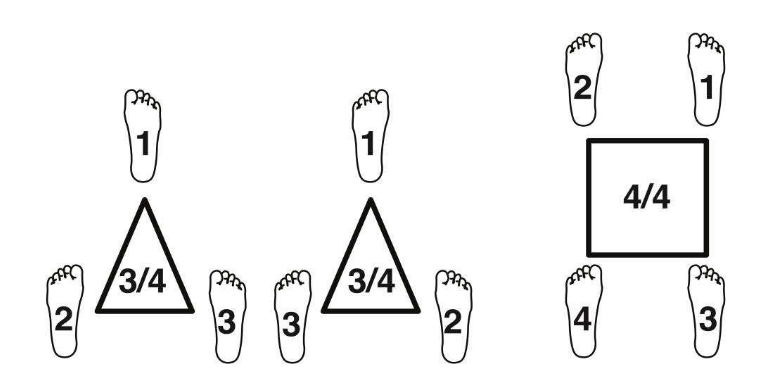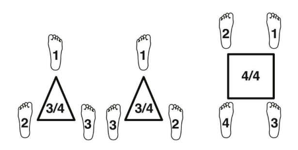 Esta atividade consiste em mover-se no espaço formando com os pés os vértices de uma figura geométrica, quadrado ou triângulo. Quando este movimento é feito mecanicamente, adicionamos palmas aos diferentes números que compõem a figura geométrica, trabalhando assim no plano horizontal (extremidades superiores e inferiores). Esses estímulos são indicados de forma totalmente aleatória e inesperada, de modo que a concentração deve ser máxima para poder coordenar ambas as extremidades. A seguir, acrescenta-se a todos esses movimentos mais uma tarefa que consiste em cantar uma pequena canção ou melodia ao mesmo tempo em que se fazem as figuras no chão e se indicam estímulos sobre qual número bater palmas. Ao fazer movimentos no espaço, juntamente com ritmo, melodia e linguagem, consegue-se também a ativação de diferentes lobos cerebrais. Outra sequência dessa atividade é indicar que a música não é cantada, mas sim silêncio, mentalmente cantam a melodia, pois em algum momento completamente aleatório eles são instruídos a cantar a música no exato momento em que ela estava se desenvolvendo mentalmente. Desta forma trabalhamos também a memória musical e a escuta interna.