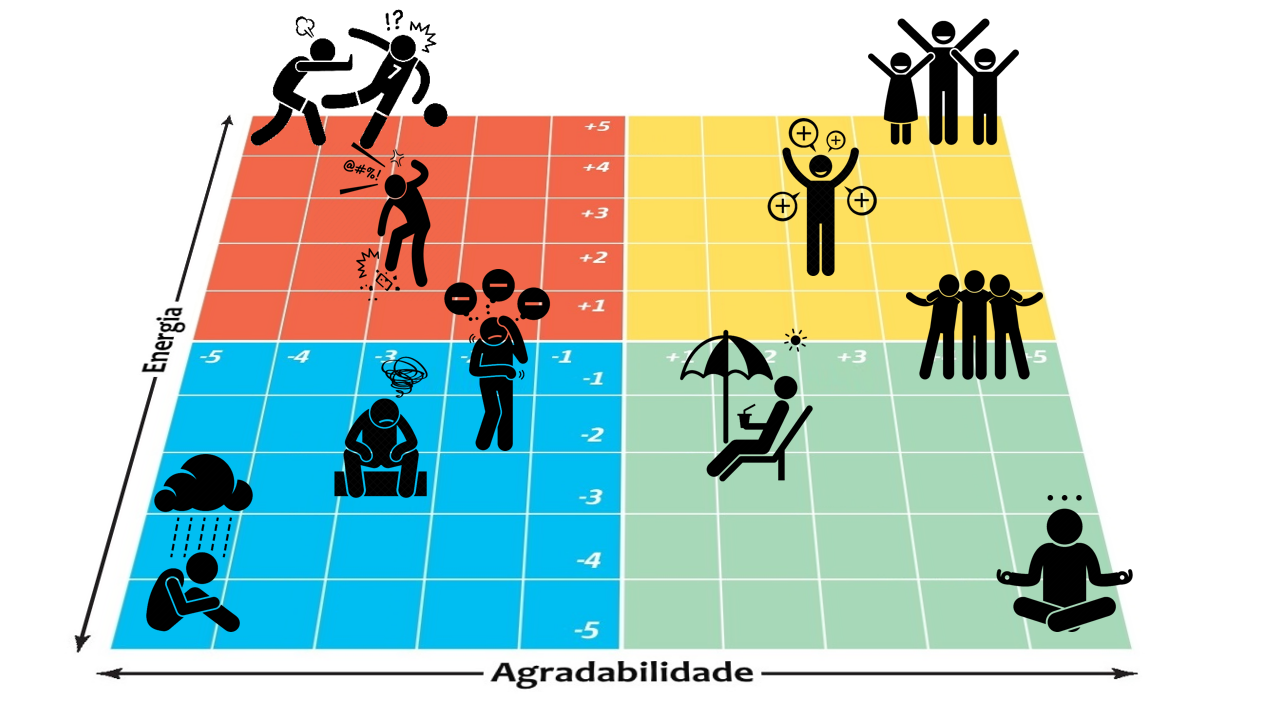 A competição promove emoções no quadrante vermelho e o insucesso na competição e na avaliação escolar promove emoções no quadrante azul do Mood Meter. Os Estados Hipometabólicos facilitam os estados coerentes (coerência psicofisiológica) e o contacto com os estados de paz e calma interiores.