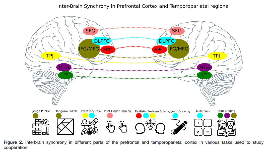 Artur Czeszumski e colaboradores no estudo Cooperative Behavior Evokes Interbrain Synchrony in the Prefrontal and Temporoparietal Cortex: A Systematic Review and Meta-Analysis of fNIRS Hyperscanning Studies, referem que os seres humanos são uma espécie cooperativa. Os seres humanos cooperam em pequena escala, como amigos ou família e, em escala maior, como Estados-Nação. No entanto, existem muitos casos em que a cooperação falha, desde os argumentos conflituosos entre casais passando por conflitos políticos, levando a resultados abaixo do ideal tanto para os indivíduos como para a sociedade. Para compreender as complexidades da cooperação e ajudar as pessoas a melhor perceber o seu potencial cooperativo, é útil e necessário obter uma melhor compreensão científica da cooperação. Uma questão científica fundamental é a forma como a cooperação se processa no cérebro. Nas últimas três décadas, surgiu uma grande literatura sobre a neurociência social. Uma limitação da investigação tradicional em neurociência social é que os participantes não estão diretamente envolvidos na interação social. Para ultrapassar este problema, os investigadores adotaram uma abordagem neurocientífica verdadeiramente social envolvendo uma segunda pessoa. Na neurociência da segunda pessoa, os processos neuronais são examinados dentro do contexto de uma interação social recíproca em tempo real. O desenvolvimento recente em neuro-imagiologia permitiu o chamado “hyperscanning”, onde a atividade de dois ou mais cérebros pode ser avaliada simultaneamente enquanto as pessoas estão a interagir. A atividade inter-cerebral resultante é geralmente caracterizada em termos da sincronização da atividade funcional dos cérebros que interagem. Até ao momento, os estudos de “hyperscanning” revelaram que a sincronização intercerebral desempenha um papel crucial na atenção conjunta, na comunicação e coordenação interpessoal, na cooperação e na tomada de decisões.