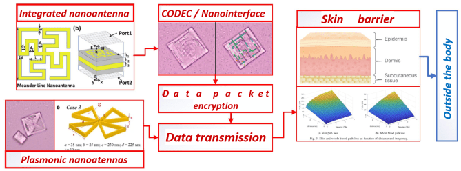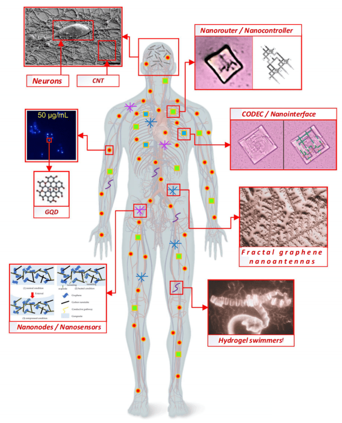 - Intra-Body nano network: a nano-rede é um conjunto de objetos e elementos com a capacidade de interagir entre si através de sinais sob a forma de impulsos, ondas eletromagnéticas e campos elétricos, podendo também operar no espetro molecular. Podemos distinguir dois tipos de filamentos nas nano-redes: aquelas que estão fixas no cérebro e as fixas no resto do corpo.