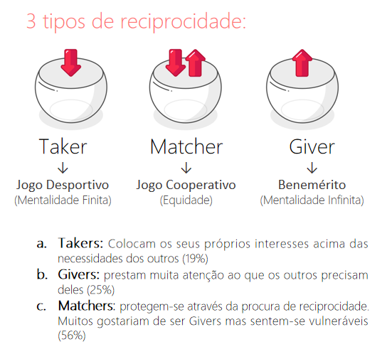 Adam Grant no seu livro Give and Take introduz dois tipos de pessoas que se situam nos extremos opostos do espectro de reciprocidade designando-as por tomador (aproveitador, ficar com, aproveitar) e dador (aquele que dá, partilha). Os tomadores e dadores diferem nas suas atitudes e ações relativamente aos outros.