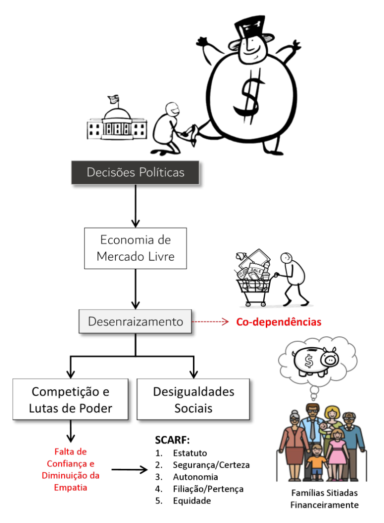 O nosso modelo de organização social e os seus valores, na forma como estão concebidos mantêm as pessoas numa constante luta pela sobrevivência. Tal como afirma Wilkinson & Pickett, The Spirit Level (2009): “Portugal é dos países que apresentam maiores desigualdades sociais as quais estão muito correlacionadas com problemas de saúde e problemas sociais. As desigualdades sociais constituem um divisor social poderoso afetando a nossa capacidade para identificar e empatizar com outras pessoas. Quanto maiores são as desigualdades sociais (stresse) tanto maior é a falta de confiança entre as pessoas”. As sociedades competitivas reforçam esta polarização social acentuam as desigualdades sociais (stresse) e aumentam a falta de confiança entre as pessoas porque se comparam constantemente em termos sociais. Podemos verificar que a causa deste caos social está profundamente associado ao “modelo competitivo e às lutas pelo poder“.