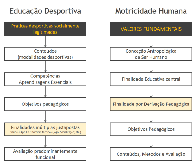A diferença essencial entre a Educação Física Desportivizada e a Motricidade Humana não reside nas práticas em si, mas no seu estatuto pedagógico. No desporto, a antropologia existe, mas está naturalizada; na Motricidade Humana, a antropologia é assumida como fundamento e critério de decisão pedagógica.