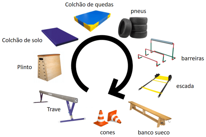 Exemplo de materiais que podem ajudar a criar um circuito psicomotor – percurso de obstáculos:
