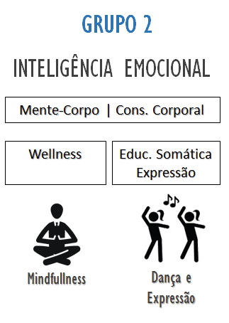 GRUPO 2: INTELIGÊNCIA EMOCIONAL – Mente-Corpo e Consciência Corporal: para que o aluno entre em contacto consigo próprio (“O corpo é a nossa mente subsconsciente”, Candace Pert) e explore, através das atividades e técnicas de educação somática e/ou estados hipometabólicos (meditativos/contemplativos), uma consciência corporal eutónica. Pode recorrer também a técnicas de visualização, que facilitam a regulação dos seus estados interiores, criando calma, paz e tranquilidade interior. Estão englobadas neste grupo as atividades de Wellness e as atividades rítmicas e expressivas sobretudo criativas.