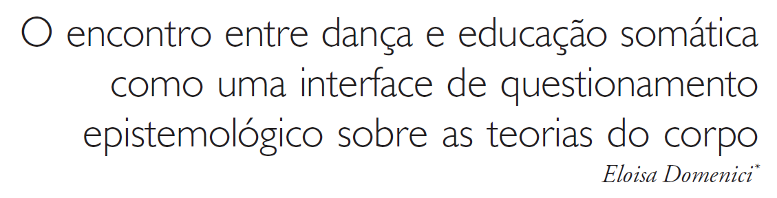 Eloisa Domenici destaca a sinergia entre a educação somática e a dança como um subespaço de produção de conhecimento qualificado sobre o corpo. Considera que as práticas de educação somática possibilitaram novos caminhos de investigação e criação, alterando profundamente os modos de fazer dança, para além da clássica epistemologia mecanicista em que se pauta o treino corporal tradicional. A educação somática é um campo emergente de conhecimento de natureza interdisciplinar que surgiu no século XX, protagonizado por profissionais das áreas da saúde, da arte e da educação. (…) O campo compreende diversos métodos de trabalho corporal, na sua maioria criados na Europa e nos EUA no início do século XX, propondo novas abordagens do movimento, a partir de pressupostos que divergem da visão mecanicista do corpo. Os seus criadores, muitos deles motivados pelo desejo de se curarem, rejeitaram as respostas oferecidas pela ciência dominante, passaram a investigar o movimento nos seus próprios corpos. Assim, esses pioneiros, Moshe Feldenkrais (Método Feldenkrais), Ingmar Bartenieff (Método Bartenieff), Gerda Alexander (Eutonia), Mathias Alexander (Técnica de Alexander), Ida Rolf (Rolfing), Mabel Todd (Ideokinesis), Bonnie Bainbridge-Cohen (Body-Mind Centering), entre outros, criaram as suas teorias baseadas nas suas próprias experiências. Os seus métodos mostraram-se eficientes e, por esses motivo, disseminaram-se nas décadas seguintes.