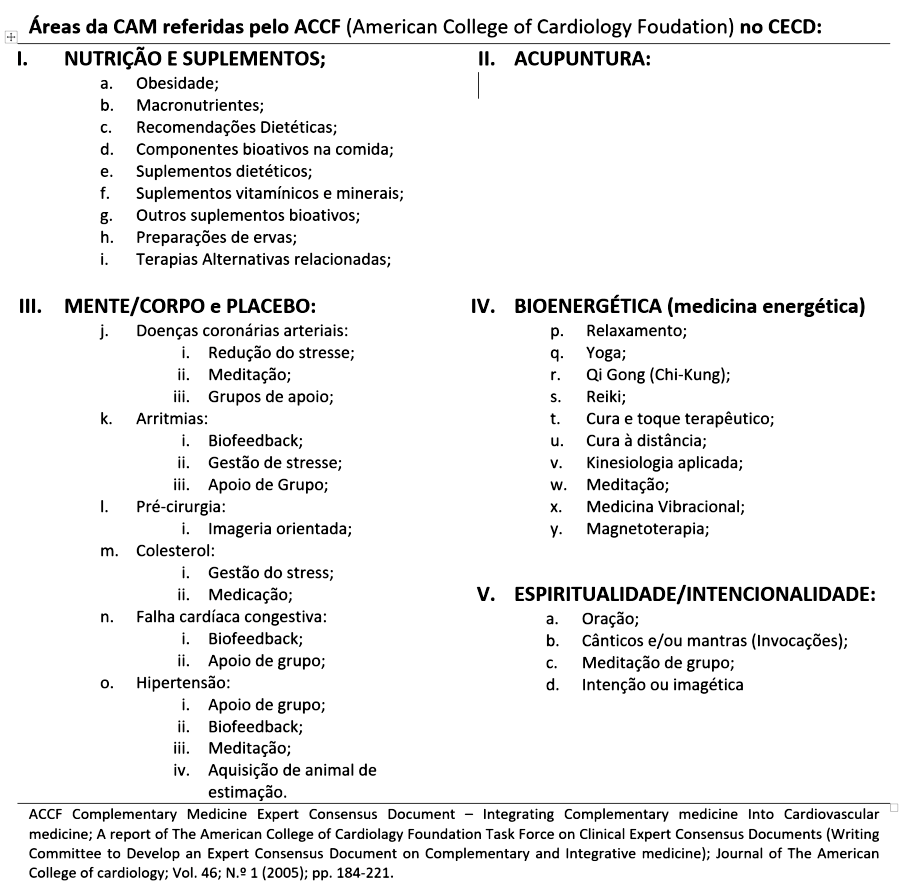 No ano 2005 foi publicado no Jornal do Colégio Americano de Cardiologia um relatório da Fundação Americana de Cardiologia um documento que traduz o consenso da Task Force (TF – grupo de trabalho), sobe a integração da medicina complementar (CAM – Complementary and Alternative Medicine), na medicina cardiovascular. Ou seja, existe uma clara abertura científica para a validade das abordagens consideradas alternativas, que só o são, porque assim são designadas. Ou seja, está-se claramente a quebrar mais um tabu científico e a dar um passo significativo no sentido da unificação de abordagens. A Task Force do ACCF (American College of Cardiology Foundation), forneceu a sua perspetiva no CECD (Clinical Expert Consensus Documents), sobre o atual estado das terapias complementares, alternativas e integrativas, sobretudo aquelas relacionadas com as doenças cardiovasculares (DCV). Na opinião desta TF, os tópicos escolhidos para serem abordados pelo CECD carecem, na sua opinião, de mais investigação de base tecnológica ou clínica a qual ainda não está suficientemente bem desenvolvida para ser avaliada pelos processos formais do American College of Cardiology/American Heart Association (ACC/AHA), para se constituírem como linhas orientadoras (guidelines). Este tópico está a ser sujeito a considerável investigação. Esta TF sobre o CECD reconhece que existe um debate considerável relacionado com a utilidade clínica das práticas da medicina alternativa que pela sua natureza, diferem bastante no seu suporte científico.